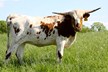 Our gorgeous Lily Langtree is a Sebastian daughter (Boomerang CP X Tabasco's Lezawe). She is gentle, a good milker, and always gives us a stout bodied calf. Her dark brown on white color pattern and her lateral, twisting horns completes the pretty picture of a longhorn cow.