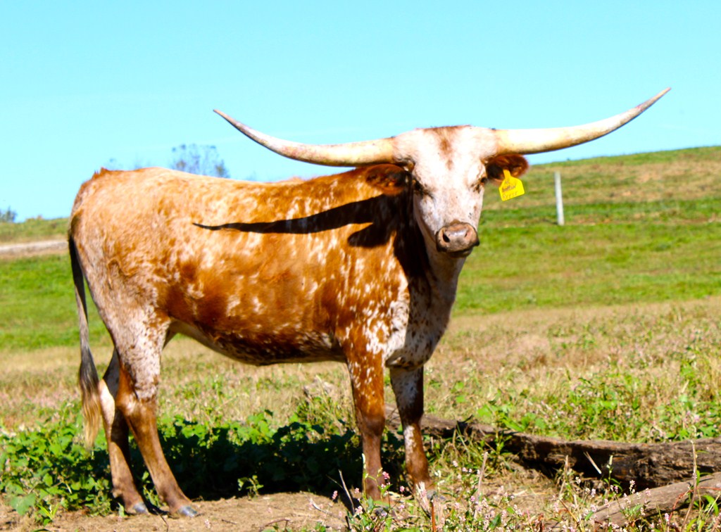 Sittin Bull and Allen's 239 daughter, what a pedigree! Very nice cow with great color. Over 70" TTT @ 4 years. Longhorns don't get much prettier.
